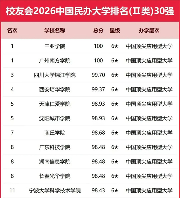 112日,全国第三方大学评价机构艾瑞深校友会网(Cuaa.Net)发布校友会2026中国民办大学排名30强。在榜单中,沈阳城市学院位列中国民办大学第五名,较2025年又进一步,并获评六星级中国顶尖应用型大学。