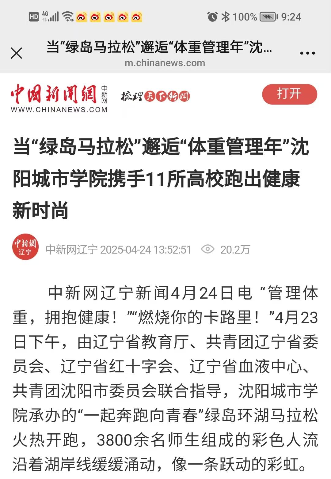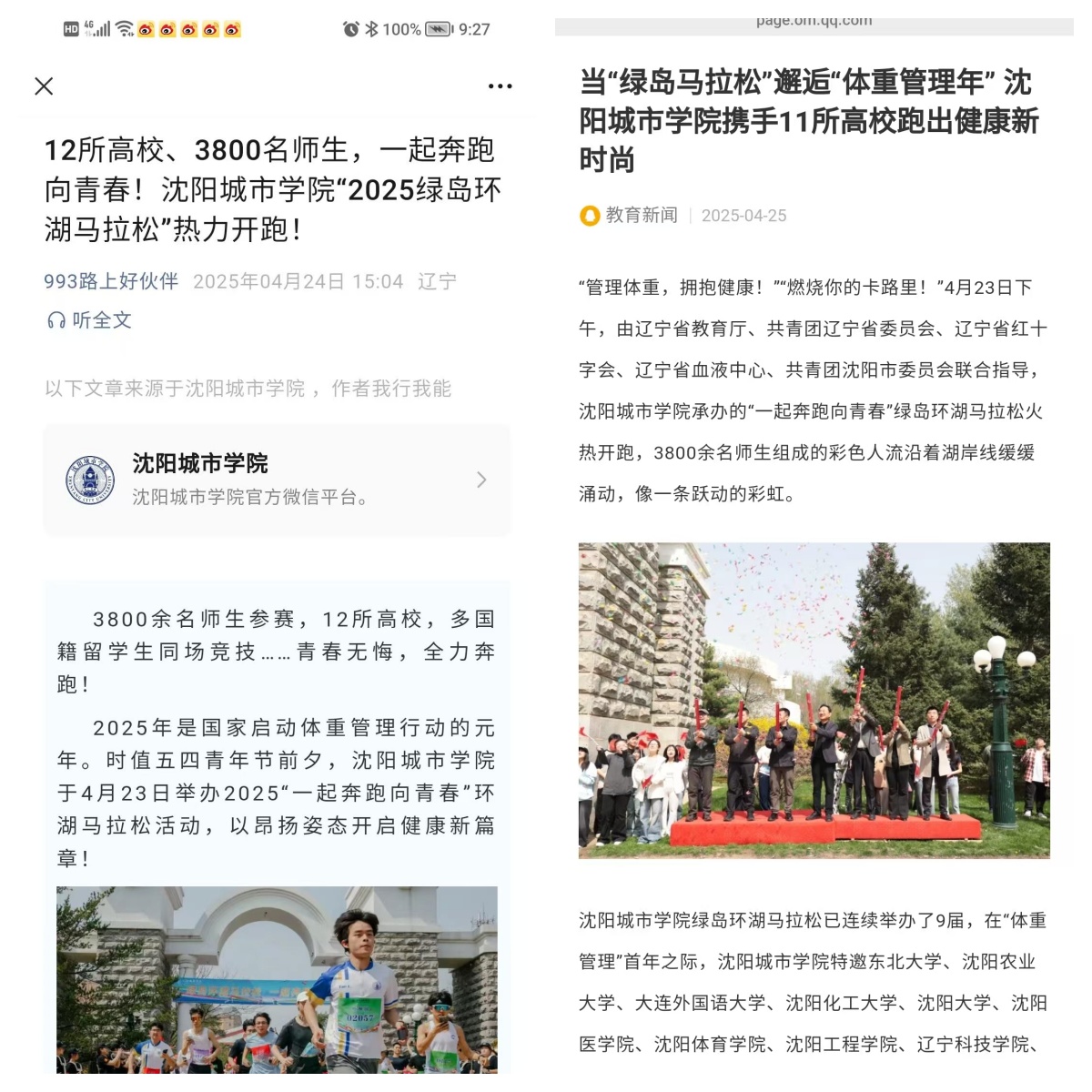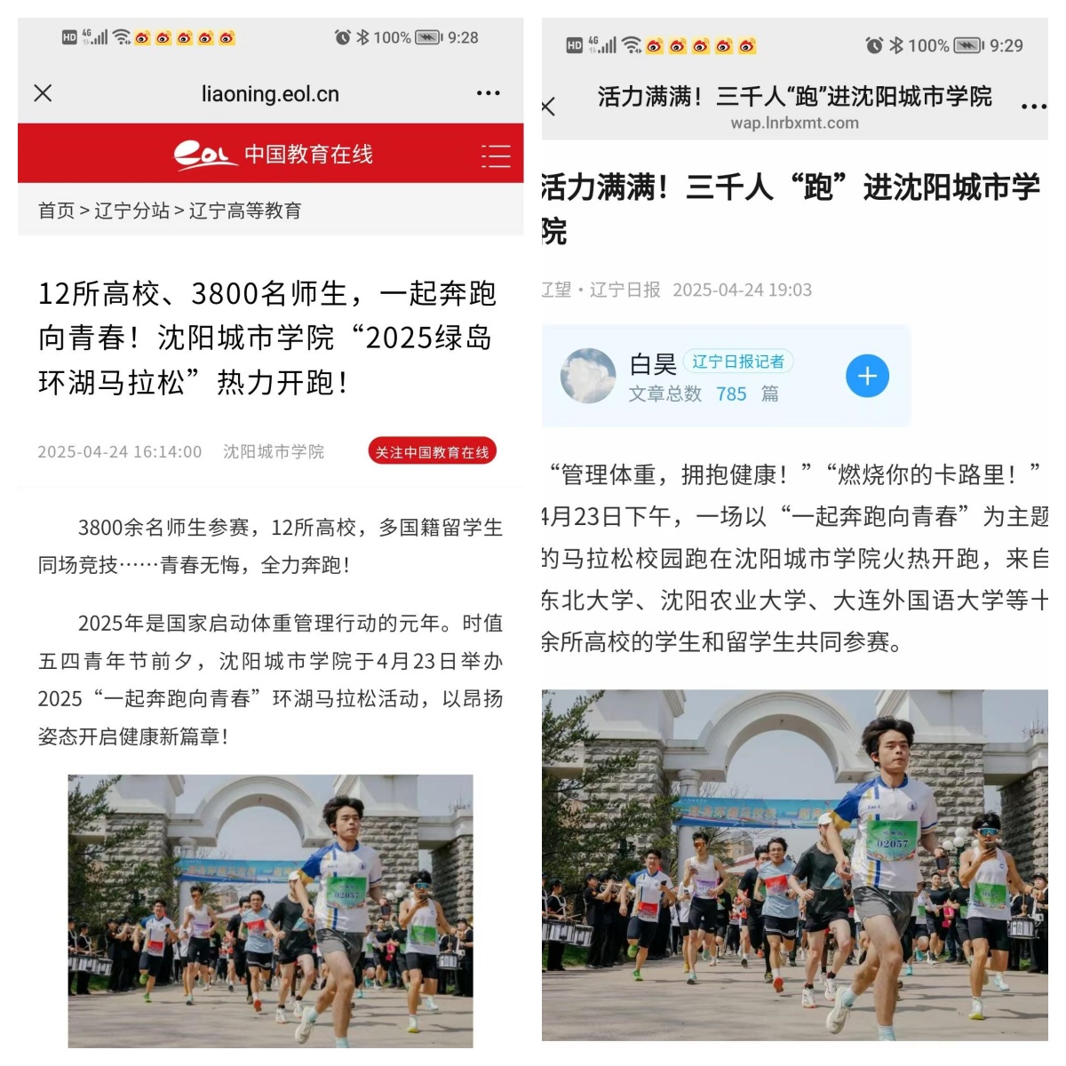 “管理体重,拥抱健康!”“燃烧你的卡路里!”由辽宁省教育厅、共青团辽宁省委员会、辽宁省红十字会、辽宁省血液中心、共青团沈阳市委员会联合指导,沈阳城市学院承办的“一起奔跑向青春”绿岛环湖马拉松得到了社会各界的关注。吸引了3800余名师生、12所高校、多国籍留学生参加的体育盛事被国内多家权威主流媒体关注,其中中国教育报、中国新闻网、中国教育在线、央广网、中国交通广播 、辽望·辽宁日报、腾讯等10余主流媒体均以大篇幅对此进行报道。