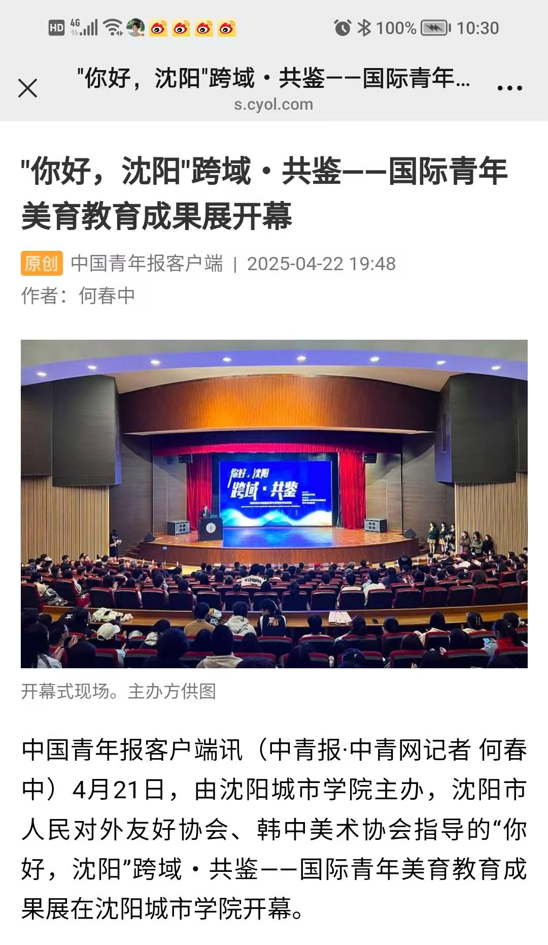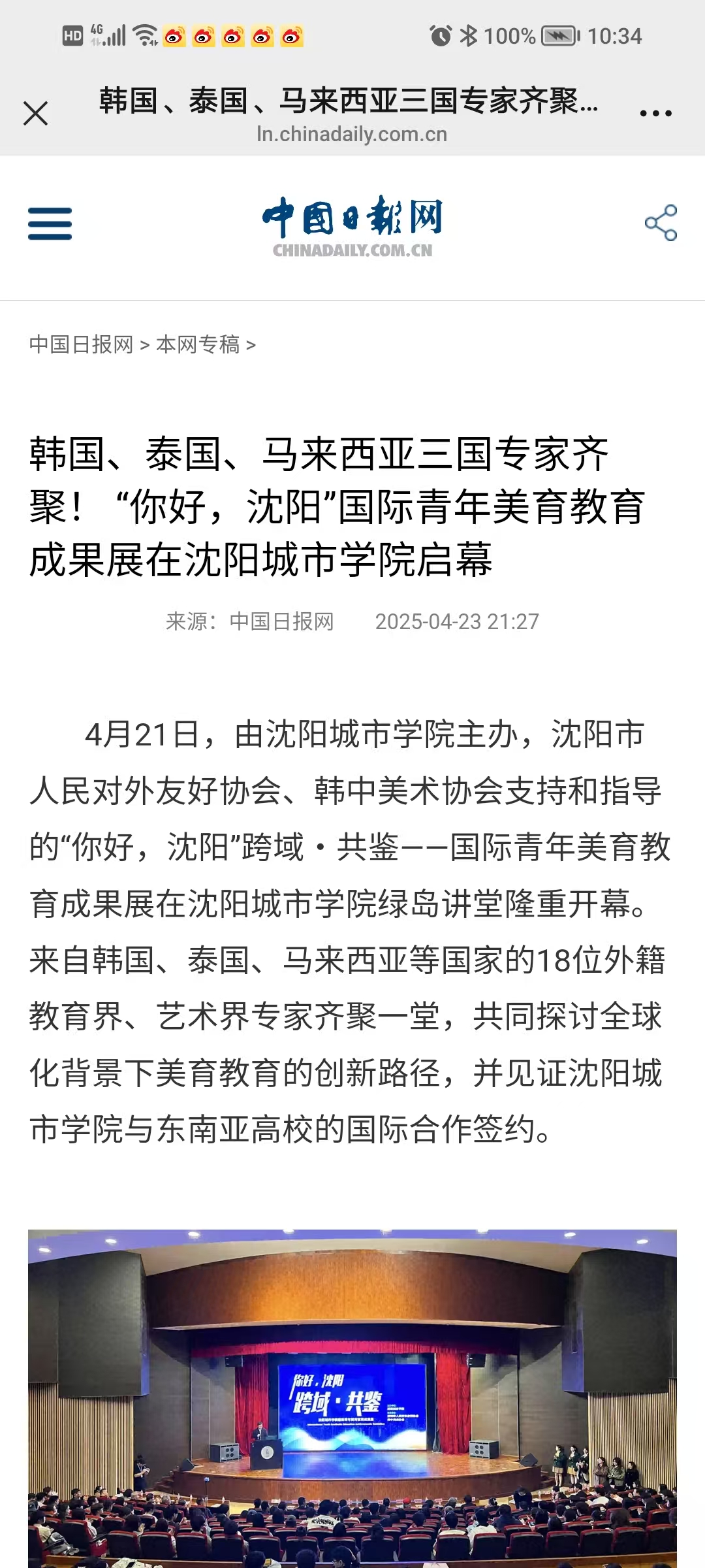 4月21日,由沈阳城市学院主办,沈阳市人民对外友好协会、韩中美术协会支持和指导的“你好,沈阳”跨域·共鉴——国际青年美育教育成果展在沈阳城市学院绿岛讲堂隆重开幕。来自韩国、泰国、马来西亚等国家的18位外籍教育界、艺术界专家齐聚一堂,共同探讨全球化背景下美育教育的创新路径,并见证沈阳城市学院与东南亚高校的国际合作签约。