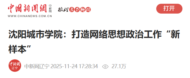 11月24日,中国新闻网客户端发表题为《沈阳城市学院:打造网络思想政治工作“新样本”》的文章,阐述了沈阳城市学院以专职网络辅导员队伍建设为核心,创新构建“精准覆盖、立体育人、双向联动”的工作模式,探索全新网络思政教育新路径的经验做法。截至发稿时,浏览量27万+。