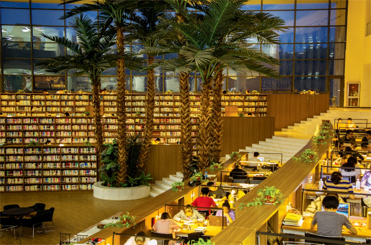 水晶宫图书馆藏书总量约53万余册、科目类别涵盖马列主义、毛泽东思想,哲学,社会科学,自然科学,综合性图书等学科领域,书架周围设阅览座位800余席,方便学生随时阅读和学习。